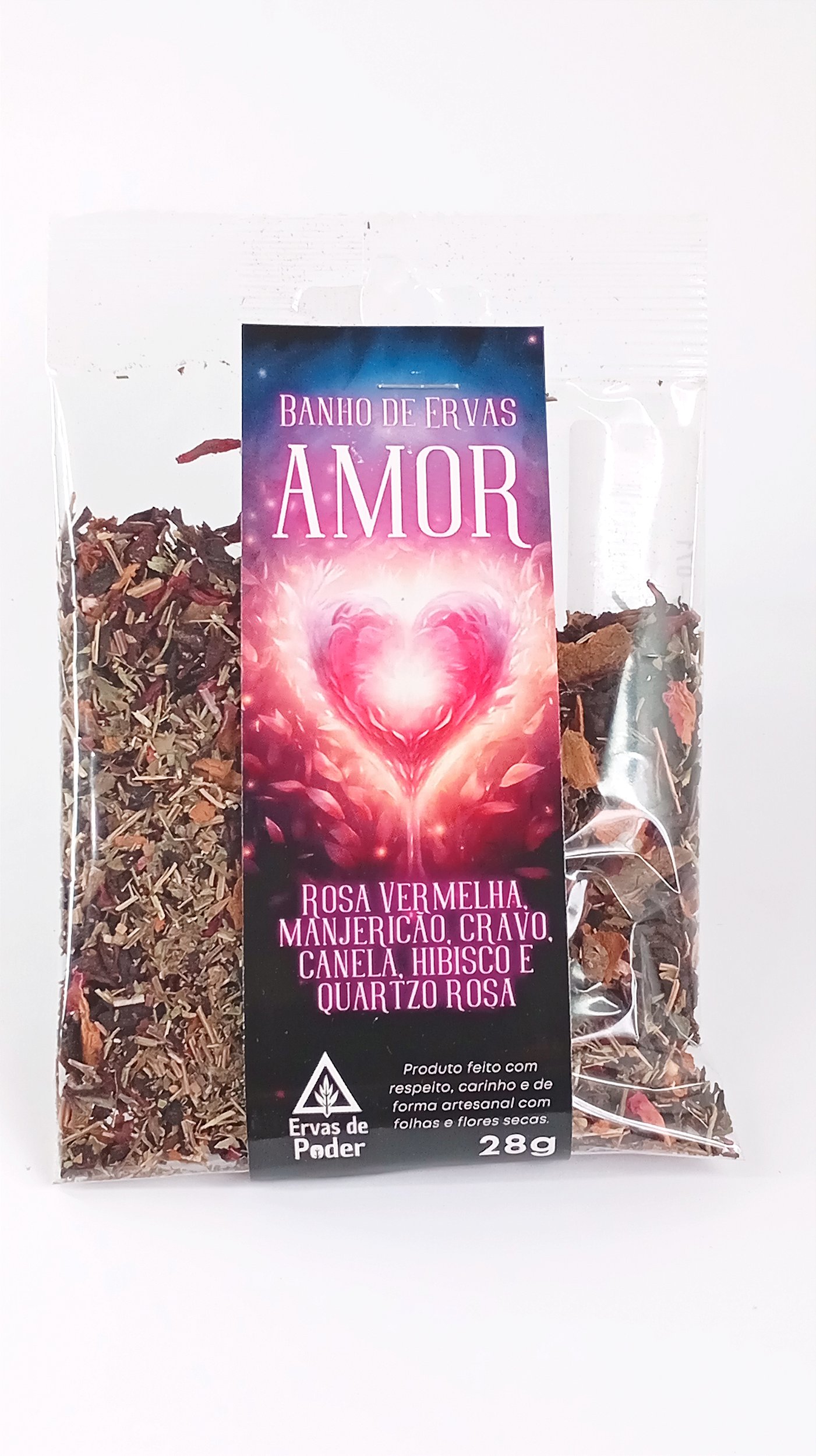 Desperte a vibração do amor em sua vida com o Banho de Ervas Amor. Uma combinação encantadora de rosa vermelha, manjericão, cravo, canela, hibisco e quartzo rosa, criada para atrair amor, fortalecer laços e abrir o coração para boas energias afetivas.
