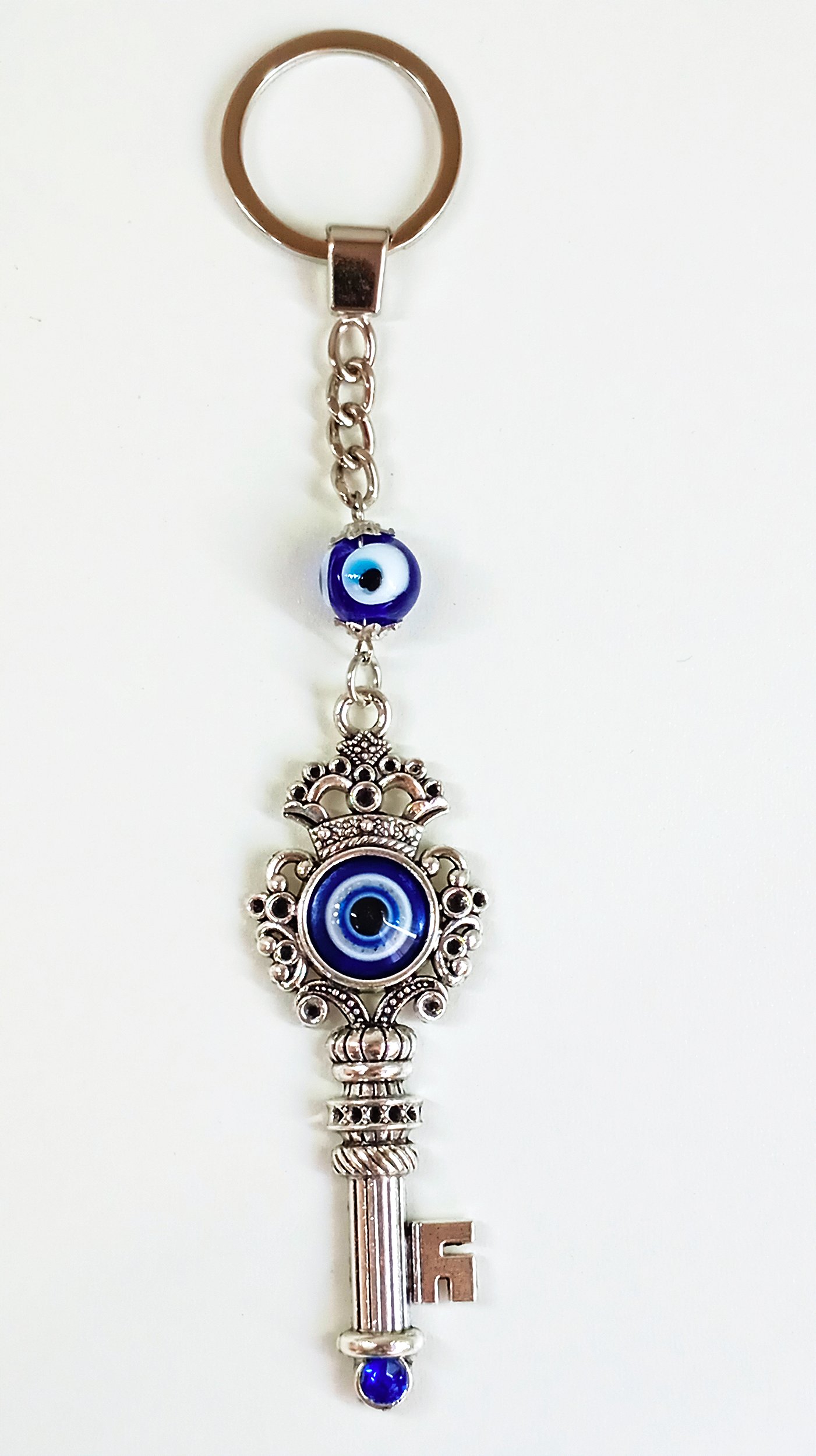 Um acessório cheio de simbologia e proteção! Este chaveiro traz o olho grego, poderoso amuleto contra mau-olhado e energias negativas, em um elegante design de chave decorada, que representa novos caminhos, oportunidades e conquistas.