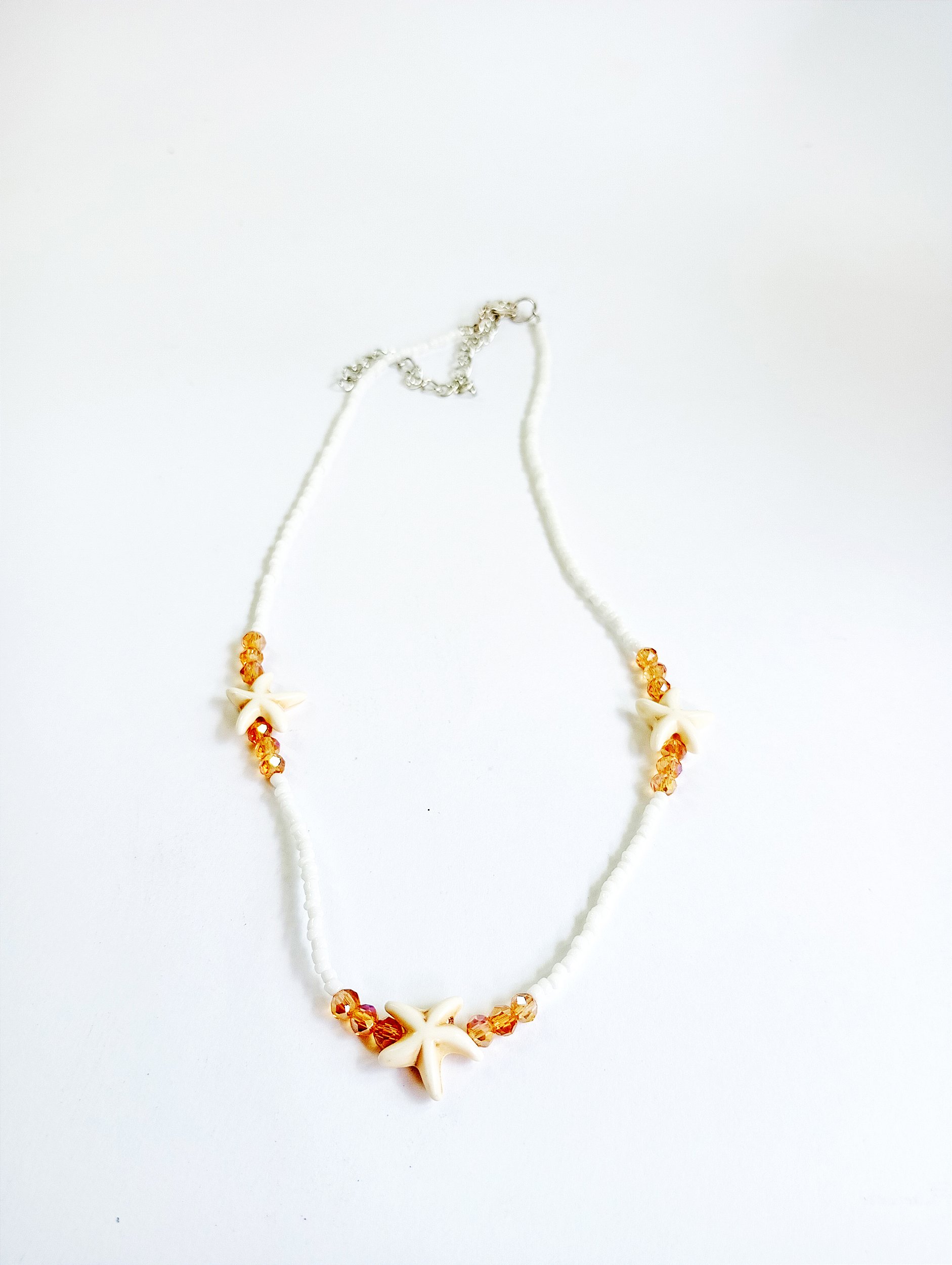 Com pequenas estrelas do mar em tons de marfim e contas cristalinas em uma laranja suave, ele adiciona um toque de frescor e leveza ao visual. Uma base de miçangas brancas completa o design, criando uma peça encantadora e ideal para quem ama a energia e a beleza do mar.