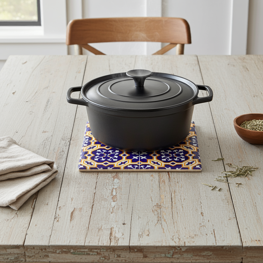 Traga mais charme e praticidade para sua cozinha com este descanso de panela inspirado nos clássicos azulejos portugueses. Além de proteger sua mesa e bancadas do calor, ele adiciona um toque de cor e elegância à sua decoração.