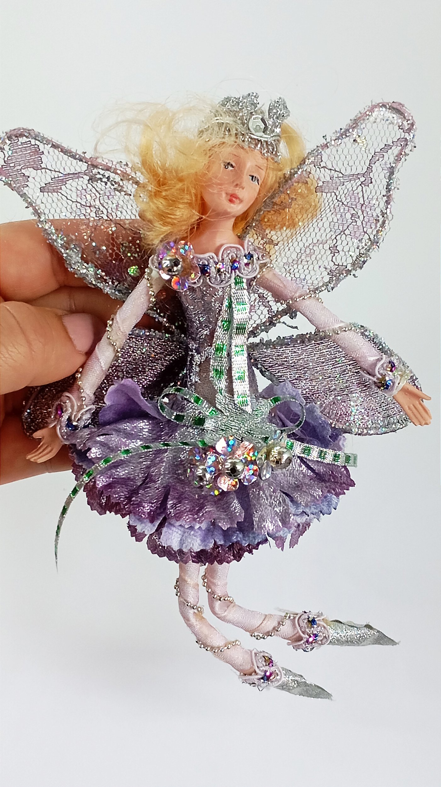 Com suas asas reluzentes e vestido cintilante em tons de lilás e prata, esta fada parece ter saído diretamente de um reino encantado. Cada detalhe — do brilho das pedrinhas às fitas que dançam com a luz — transmite leveza, encanto e proteção mágica.