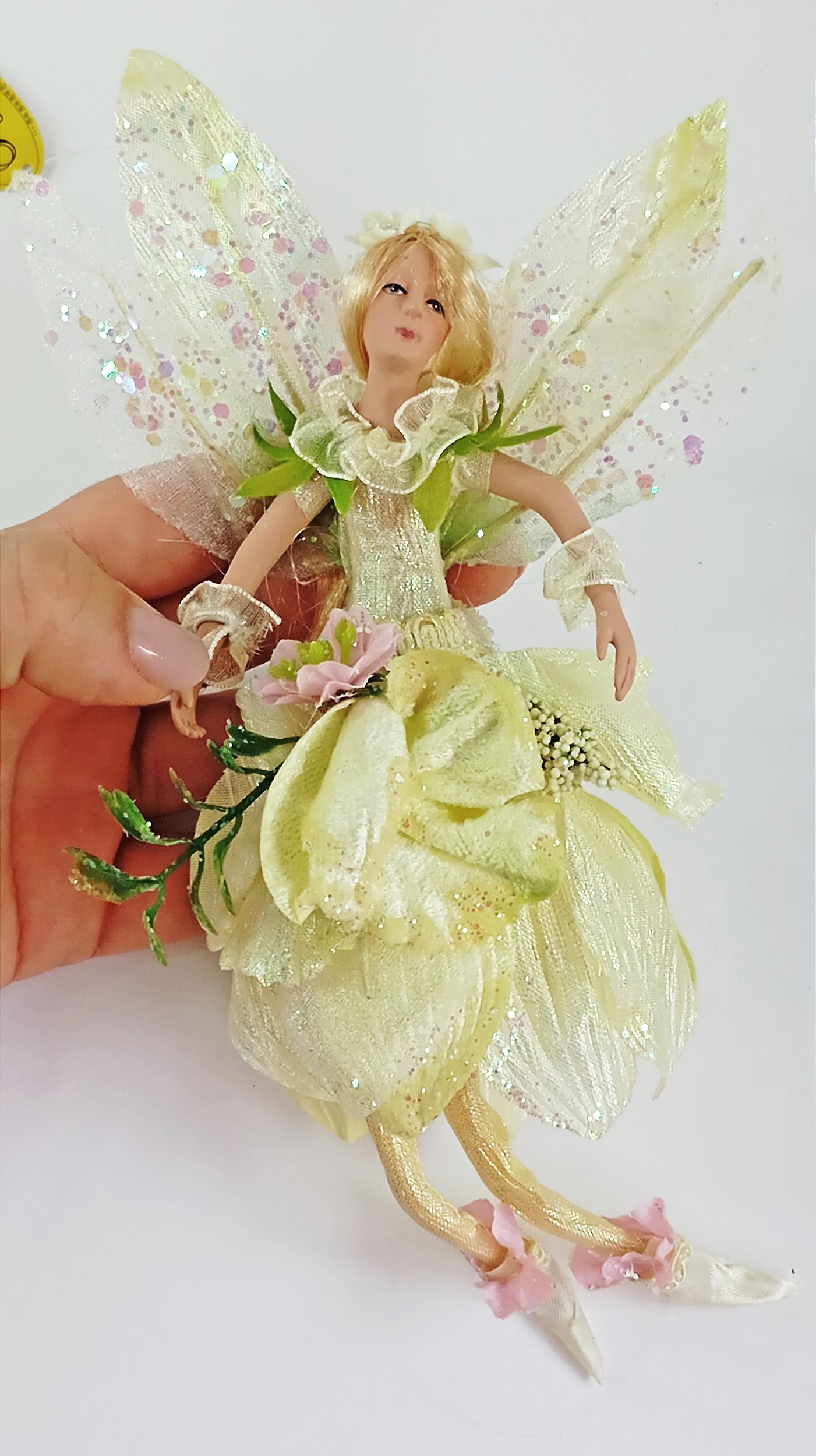 Radiante em tons de amarelo e verde, a Fada Encantada Verde carrega a energia do renascimento, do florescer e da alegria de viver. Suas asas translúcidas e seu vestido em pétalas douradas parecem vibrar com a força da natureza em plena harmonia.