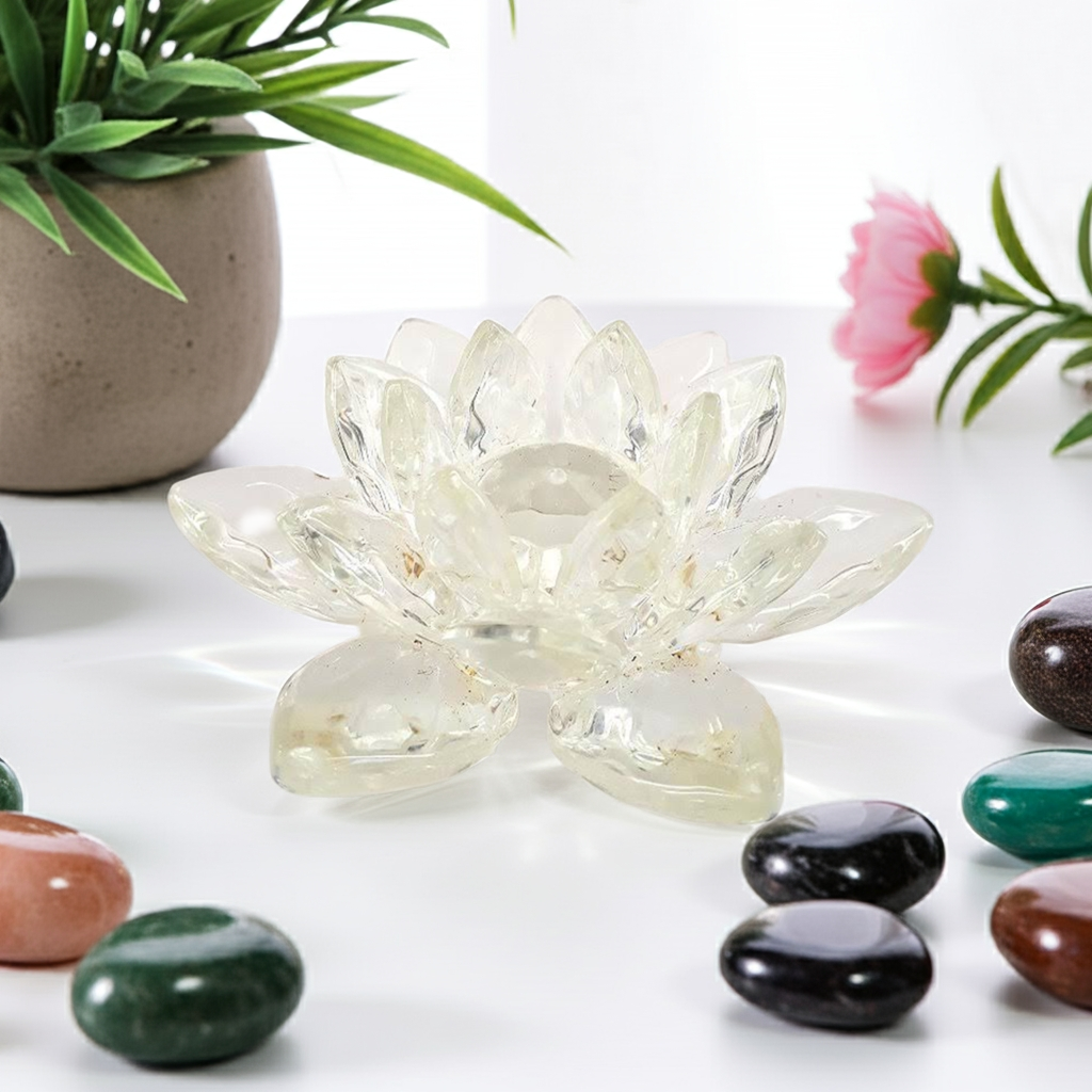 Na prática do Feng Shui e em outras tradições espirituais, o cristal é considerado um material que pode harmonizar e equilibrar as energias de um espaço. Uma flor de lótus de cristal pode ser colocada em áreas específicas de uma casa ou ambiente de trabalho para promover uma sensação de harmonia e equilíbrio.