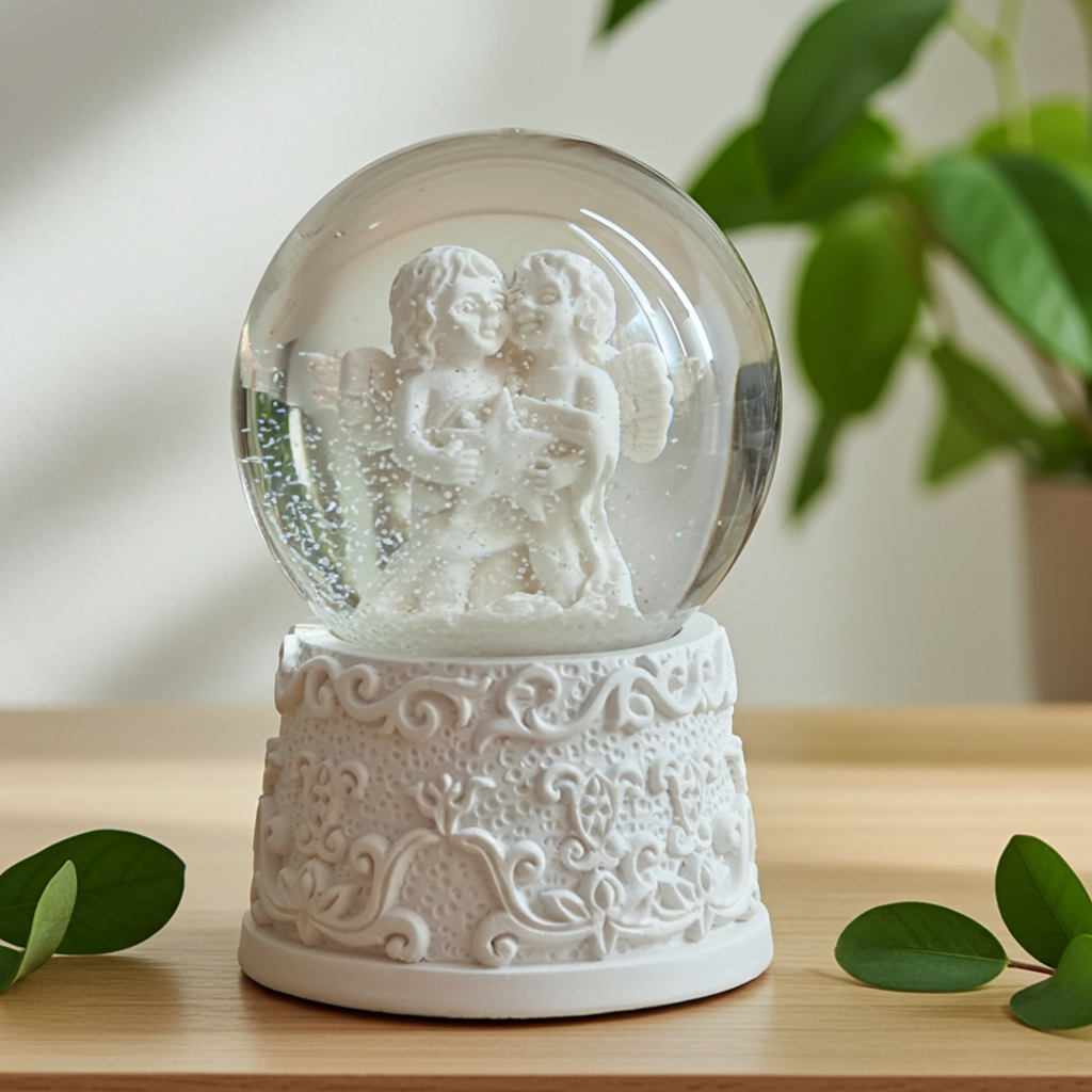 Este delicado globo de neve com um par de anjos abraçados em um cenário de neve cintilante que ganha vida ao ser sacudido. Com a base esculpida com detalhes ornamentais clássicos evoca elegância e charme atemporal. Mas a verdadeira mágica acontece ao ativar sua mudança de núcleos, que ilumina suavemente o ambiente e cria uma atmosfera encantadora, que muda de cor.