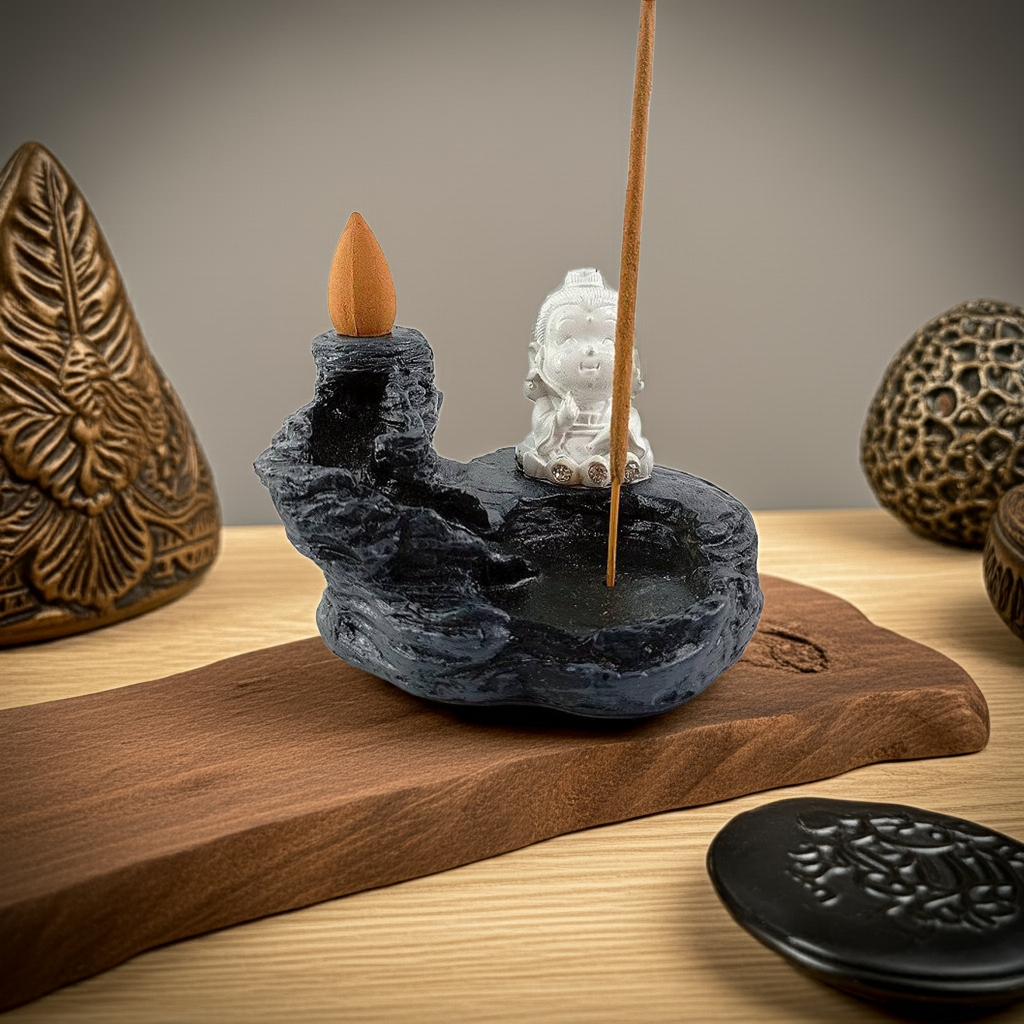 A combinação do efeito de cascata da fumaça e a queima lenta das varetas cria um ambiente visualmente atraente e aromático. Permite a mistura de diferentes tipos de incenso, combinando os aromas dos cones e das varetas para uma experiência olfativa rica e variada.