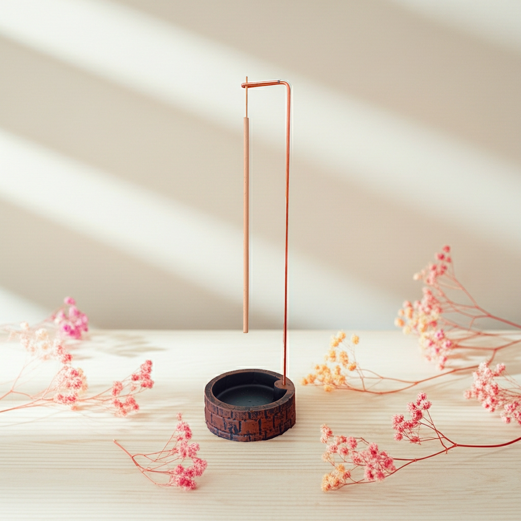 Este elegante incensário une o minimalismo contemporâneo ao charme rústico em um design único e funcional. Com uma haste de cobre polido e base em resina de textura artesanal, ele mantém o incenso suspenso, permitindo que a fumaça flua suavemente, criando um efeito visual encantador enquanto purifica o espaço.