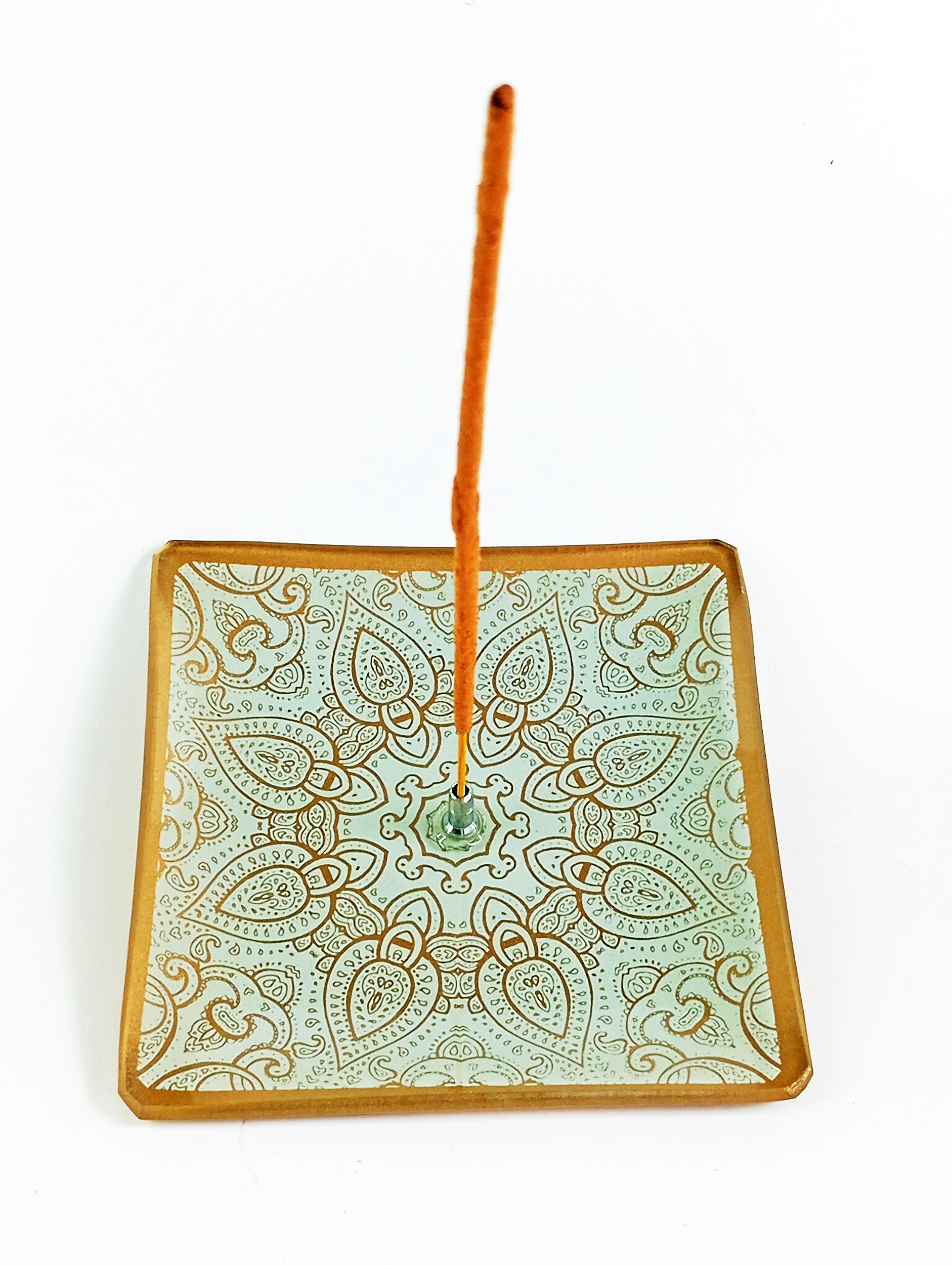 Este incensário de vidro possui um design elegante de mandala com detalhes em dourado, ideal para quem busca estilo e espiritualidade na decoração. A peça traz um toque refinado ao ambiente, sendo perfeita para altares, espaços de meditação e decoração de interiores.