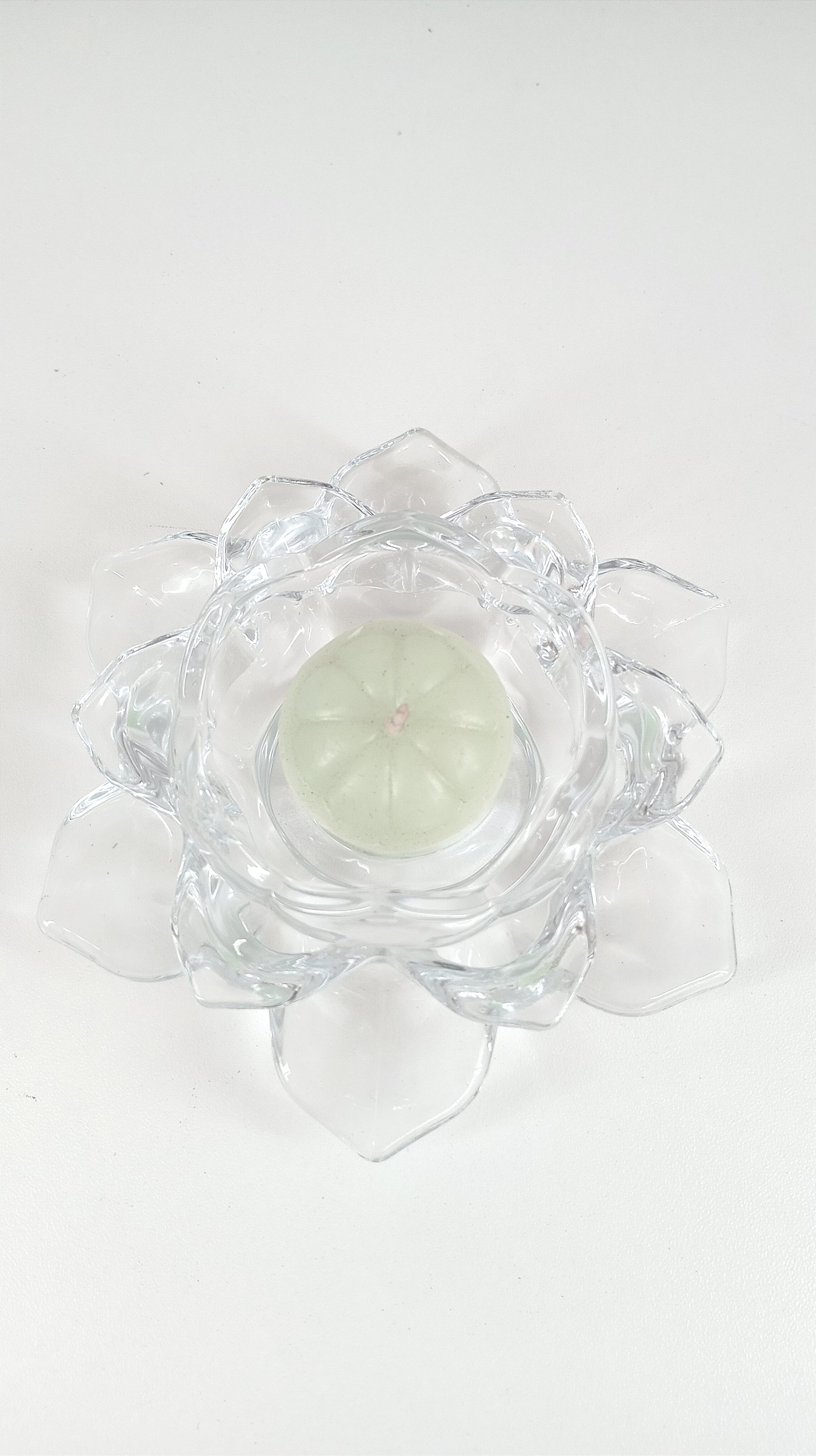 Castiçal em formato de flor de lótus em vidro, perfeito para criar um ambiente de paz, harmonia e espiritualidade. Seu design delicado em pétalas transmite leveza e pureza, tornando-se um item ideal para altares, rituais, meditação ou simplesmente para decorar com sofisticação.