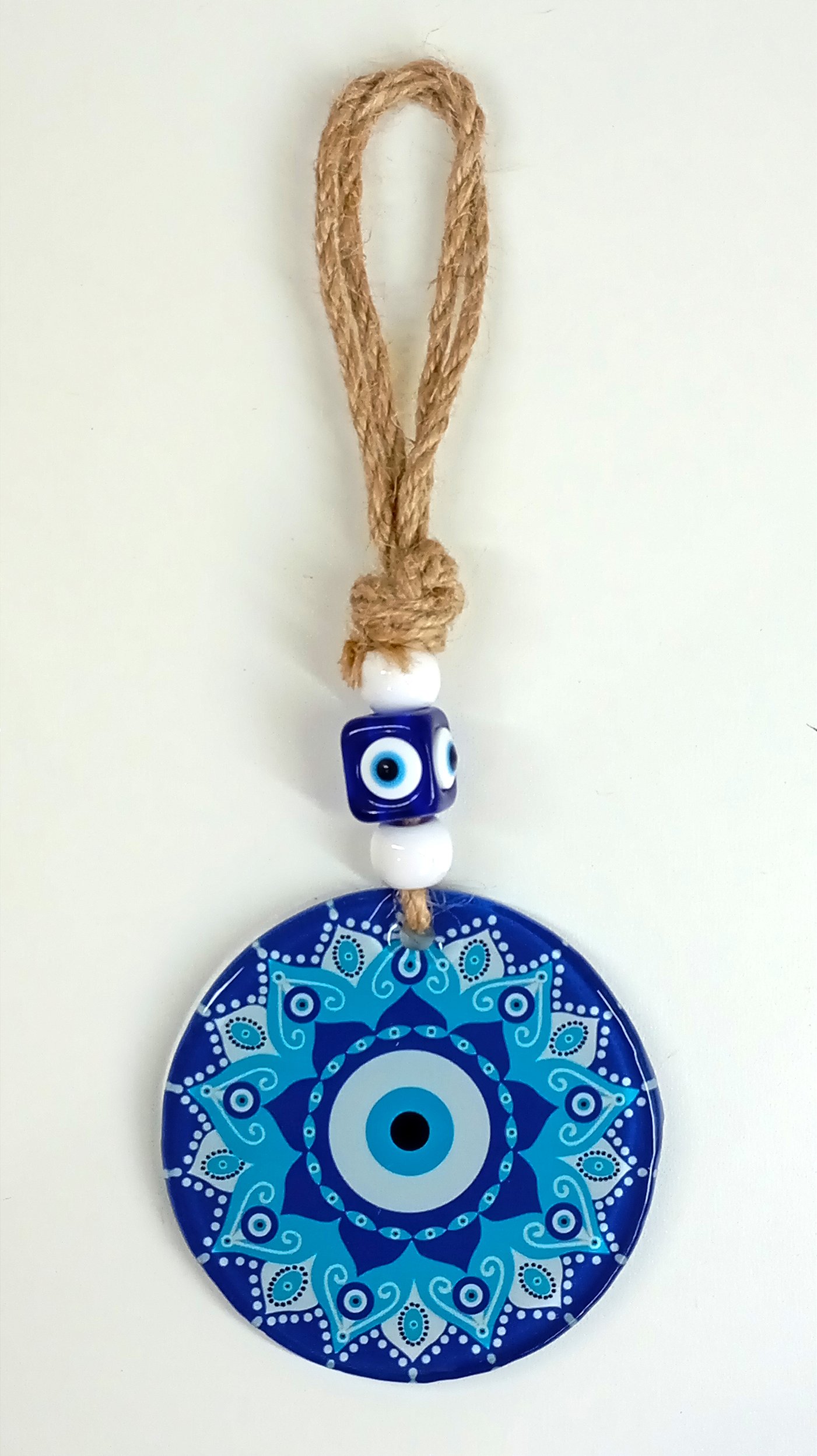 Feito em material resistente e decorado com cores vibrantes em azul, branco e turquesa, é ideal para pendurar em portas, paredes, salas ou escritórios. Além de sua função protetiva, adiciona um toque místico e elegante à decoração.