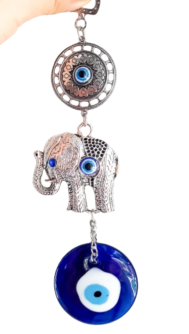 O Pendente Elefante simboliza a presença divina e a bênção dos deuses. O Olho Grego é tradicionalmente usado como um talismã para proteger contra energias negativas.