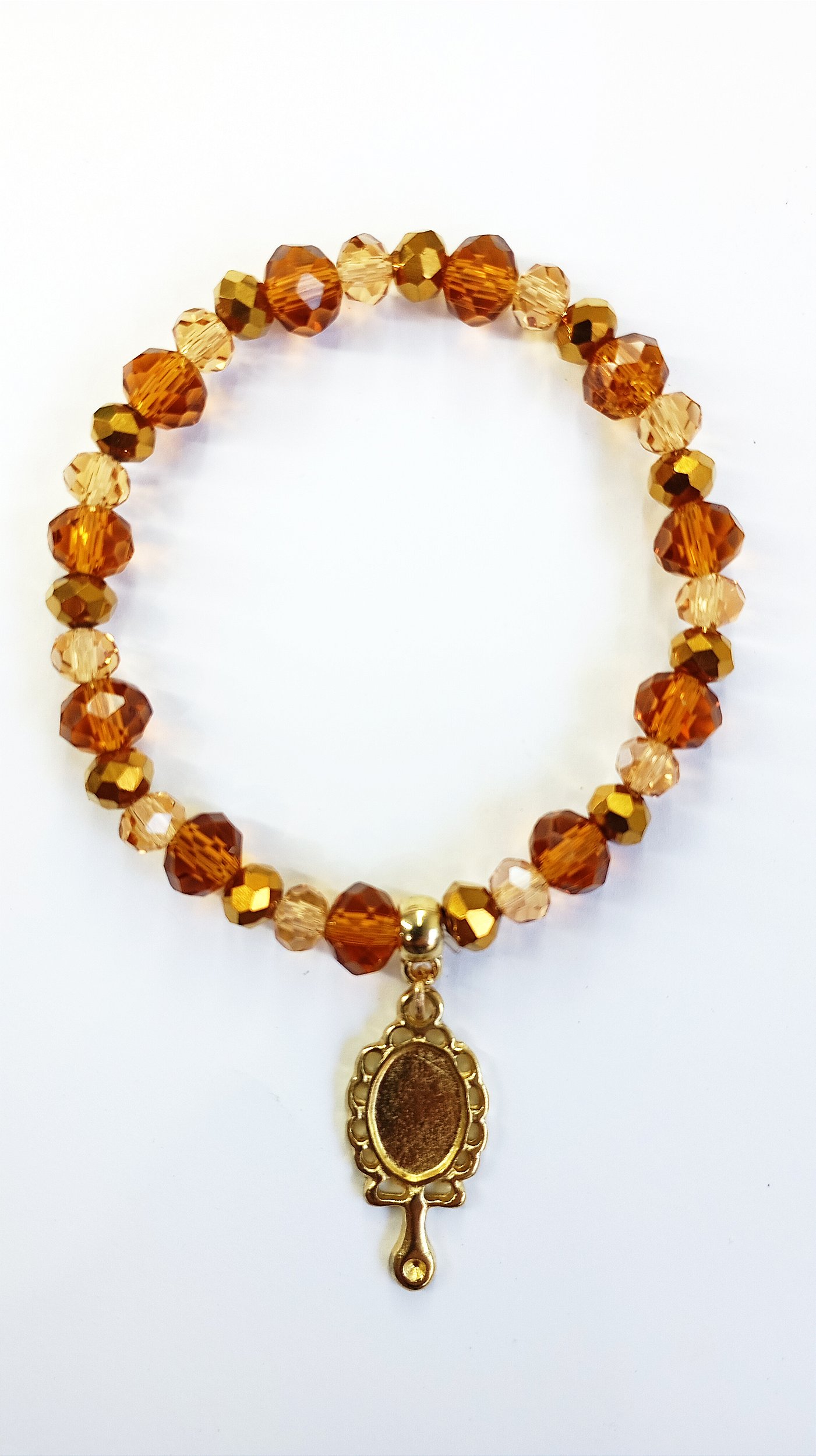 Conecte-se com a doçura e o poder de Oxum, a Orixá das águas doces, do amor e da abundância! Esta pulseira é adornada com cristais dourados vibrantes, com pingente de espelho, simbolizando a riqueza, a beleza e a energia amorosa dessa grande mãe e protetora.