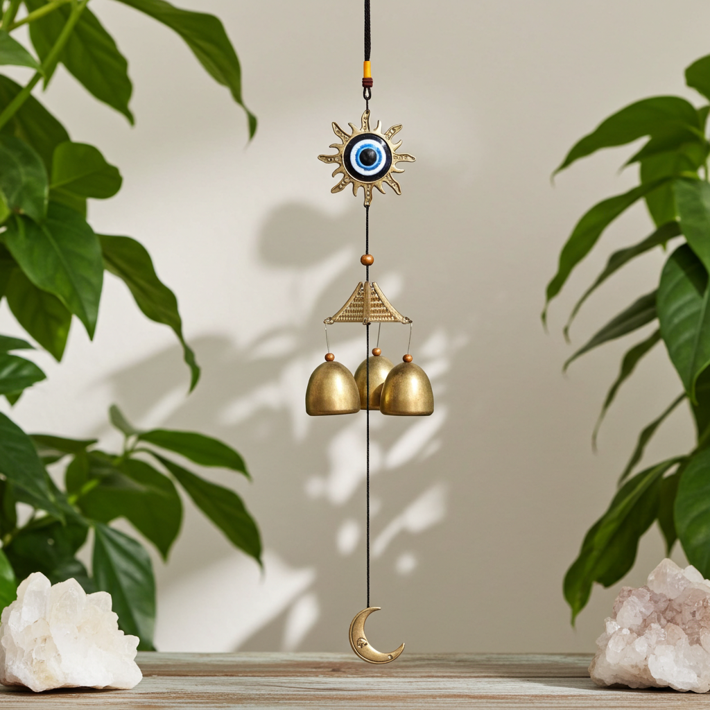 Harmonia, proteção e boas energias em um só item. Este sino de vento une o poder místico do olho grego, símbolo contra o mau-olhado, ao equilíbrio dos astros: sol e lua, representando força, renovação e intuição. Produzido em metal com acabamento artesanal, traz um som suave que purifica o ambiente e convida à tranquilidade. Ideal para decorar sua casa, altar ou espaço espiritual, oferecendo não apenas beleza, mas também proteção energética.