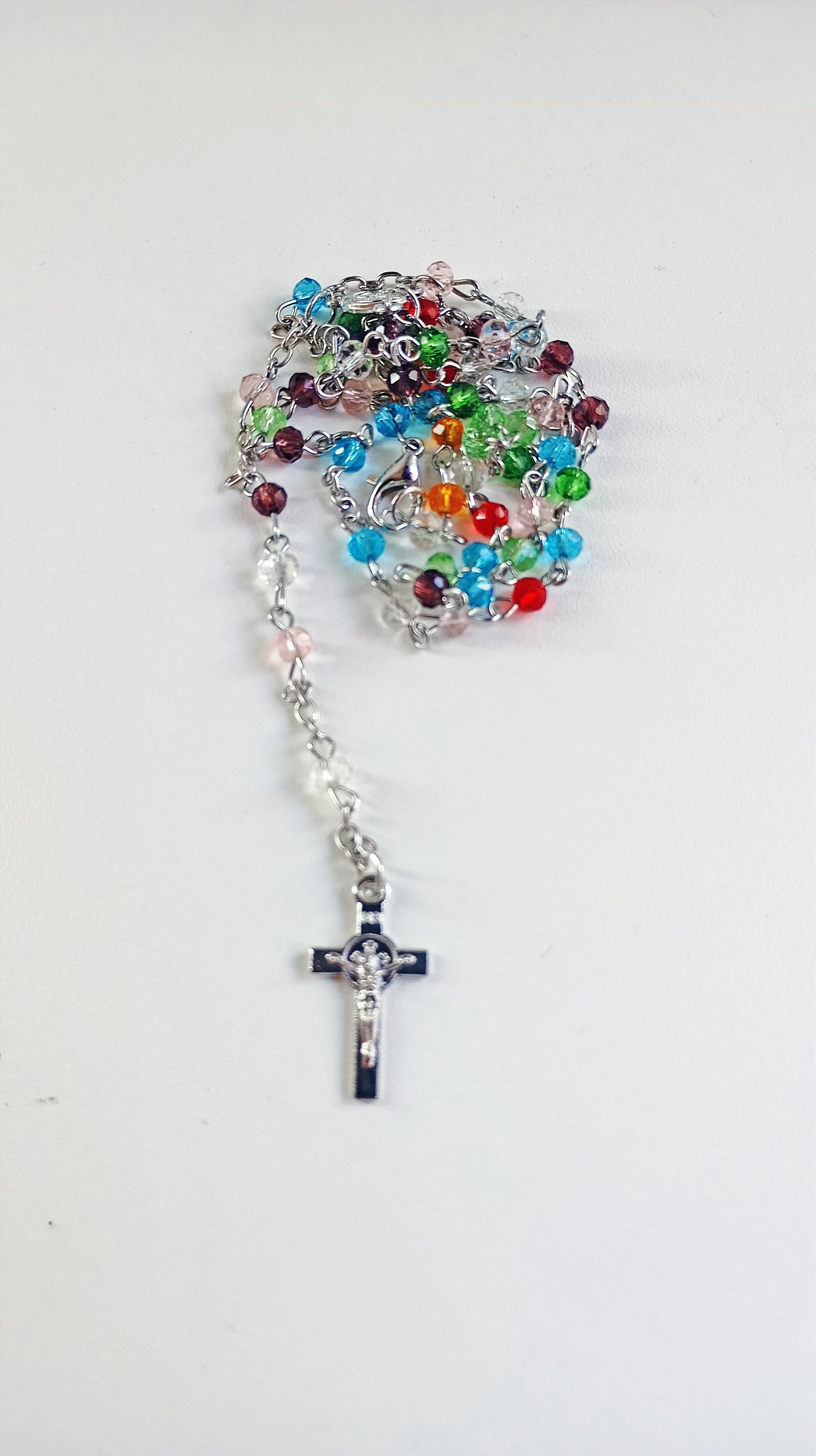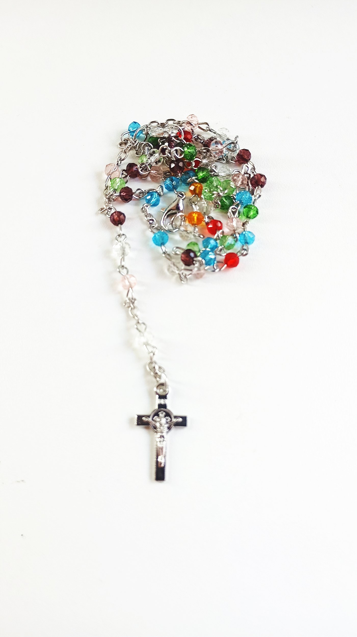 Leve mais cor, fé e proteção para o seu dia a dia com este belíssimo terço de cristais coloridos. Suas contas multicoloridas representam alegria, diversidade e energia positiva, enquanto o crucifixo prateado simboliza devoção e espiritualidade.