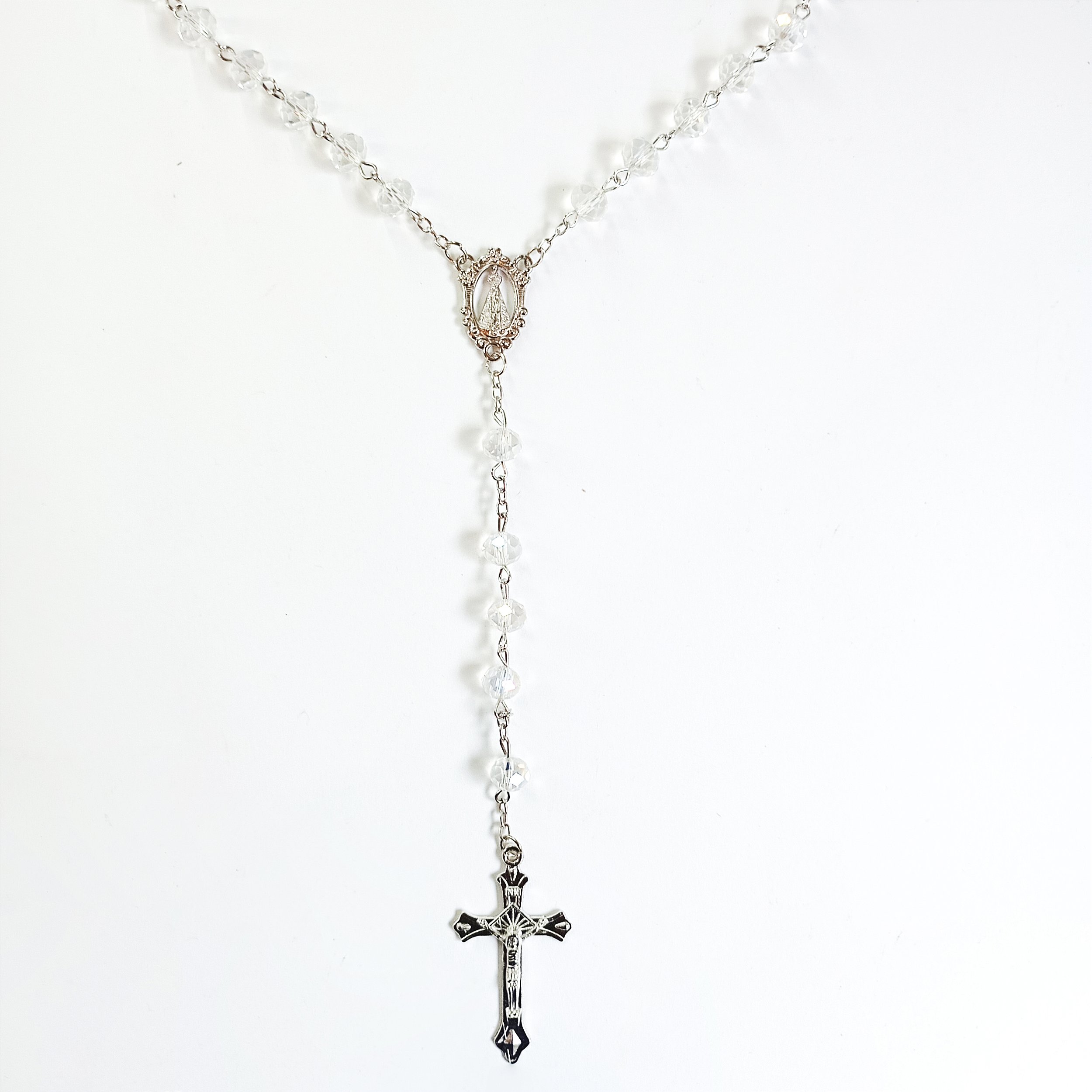 Cada detalhe foi pensado para transmitir elegância, espiritualidade e proteção. Suas contas em cristal refletem suavidade e pureza, enquanto o acabamento em dourado traz um toque de nobreza e luz às suas orações.