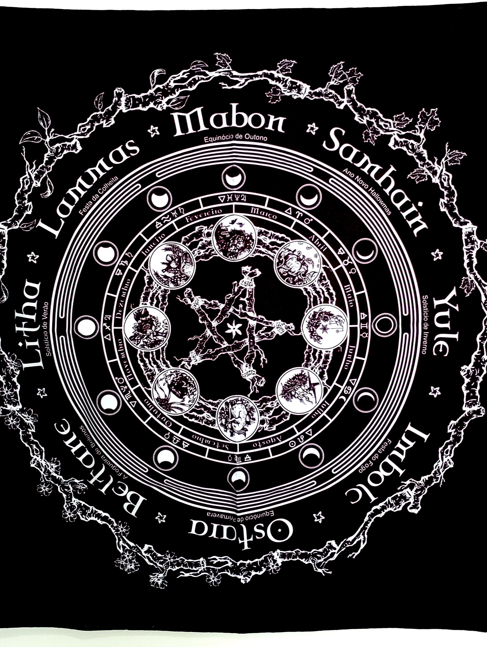 Toalha Roda Astrológica, com um design monocromático em preto e branco, usada em práticas espirituais e rituais sagrados. Ela apresenta a Roda do Ano com os oito sabás tradicionais — como Samhain, Yule, Ostara e Mabon — e as fases da lua, ajudando a acompanhar o ciclo natural e energético da Terra. Os detalhes dos símbolos lunares e astrológicos proporcionam uma estética mística, perfeita para qualquer altar ou espaço de meditação.