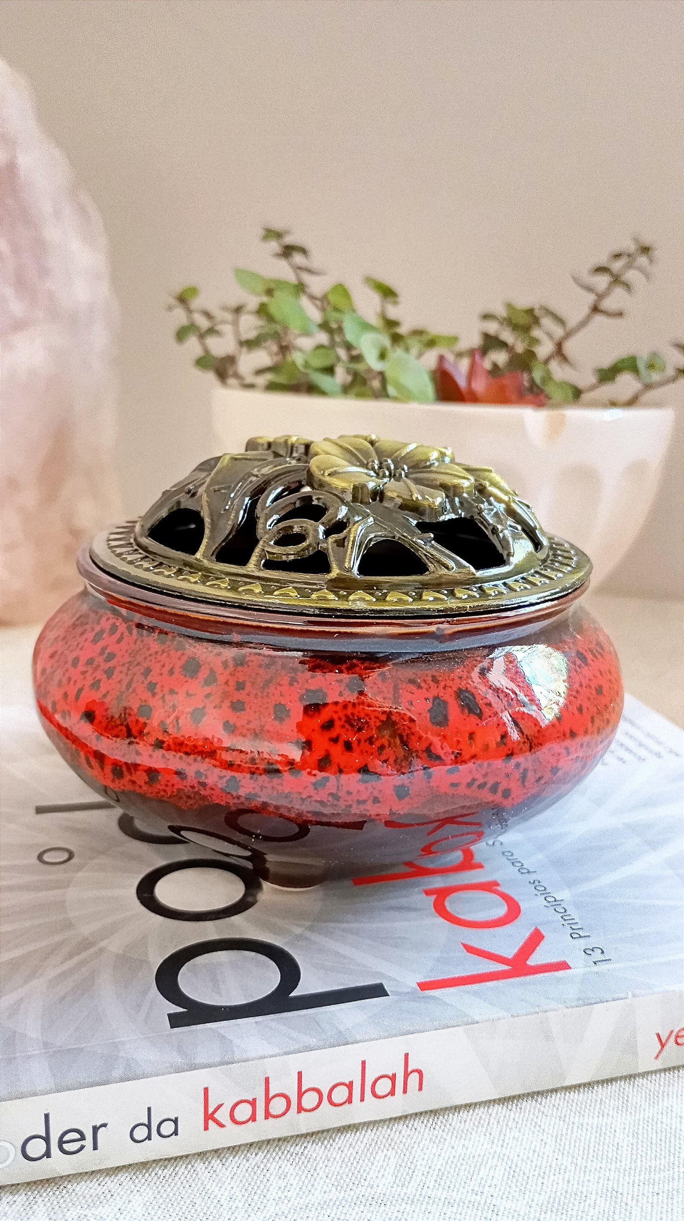 Transforme o seu espaço com este belíssimo turíbulo artesanal, feito em porcelana vermelho com acabamento craquelado e tampa em metal com detalhes florais em alto-relevo. Uma peça que une beleza, espiritualidade e sofisticação.