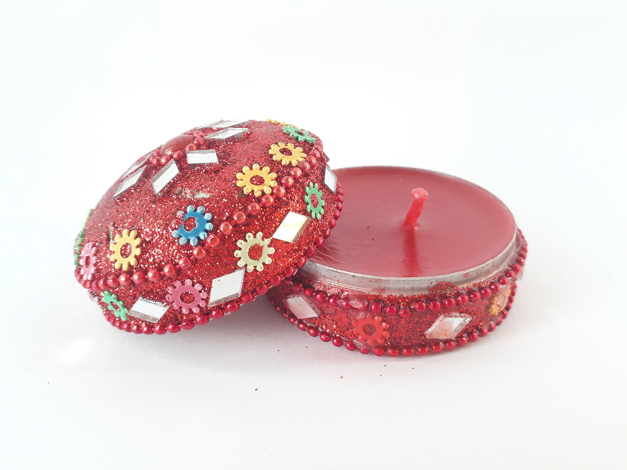 Decorada em lata de alumínio no estilo indiano, com brilhos e adornos na cor vermelho, e com mini espelhos. A vela já vem pronta para acender, com total segurança.